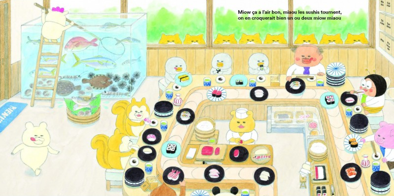 Huit matous filous observent avec gourmandise la cuisine de Maître Chien... Que ce soit dans sa boulangerie, son restaurant de sushis ou de glaces, la recette reste la même !